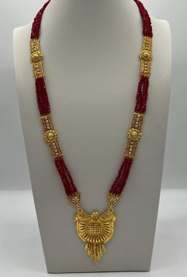 नक्काशी वाला सोने का पेंडेंट होता है जिसे लाल मोतियों की कई लड़ियों के