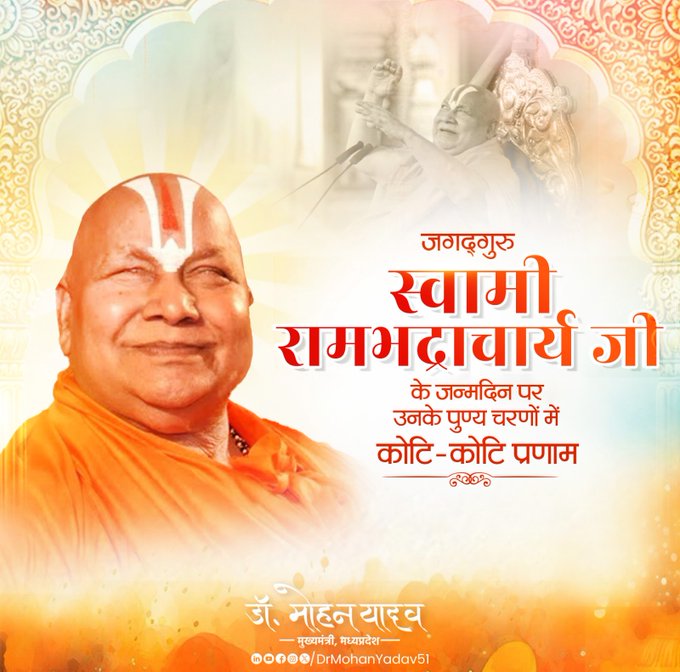 मुख्यमंत्री डाॅ यादव ने जगद्गुरु स्वामी रामभद्राचार्य के जन्मदिवस पर उनके दीर्घायु हाेने की कामना की